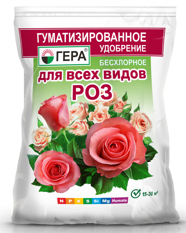 Агрохимикат «Гера для Роз гуматизированное» - смешанное удобрение для основного внесения и подкормки роз, а также других цветочно-декоративных культур, оранжерейных, комнатных и балконных цветов. Не содержит хлора и нитратного азота.